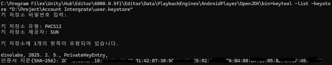 * 구글 계정 인증에는 SHA-1 이 필요한데 Unity 6 버전의 keytool을 사용했더니 256만 뜨고 나머지 지문들은 생략된다.