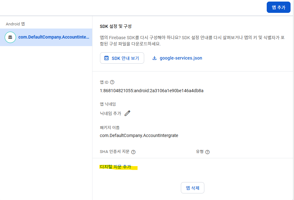 여기서 디지털 지문 추가에서 키스토어의 SHA 키를 입력한다.