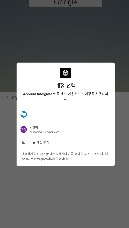 SignIn 함수 호출 시 계정 선택 UI 팝업이 뜬 후 계정을 선택하고 나서 반응이 없는 현상이 있었는데 결과를 받아서 처리하는 콜백에서 에러가 발생했었다.