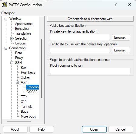 Connection > SSH > Auth > Credential 항목에서 Private key file for authentication에 생성해 놓은. ppk 파일을 선택한다.
