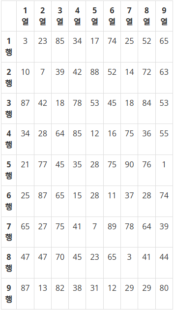 <그림 1>과 같이 9×9 격자판에 쓰인 81개의 자연수 또는 0이 주어질 때, 이들 중 최댓값을 찾고 그 최댓값이 몇 행 몇 열에 위치한 수인지 구하는 프로그램을 작성하시오. 예를 들어, 다음과 같이 81개의 수가 주어지면