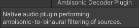 Ambisonic 클립을 사용하기 위해서는 Audio Source 컴포넌트의 Spatialize 옵션을 비활성화해야 하고 해당 클립이 재생될 때 자동으로 프로젝트에서 선택된 플러그인을 통해서 디코딩된다.