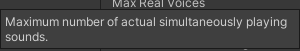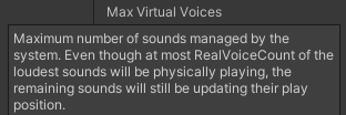 오디오 시스템이 관리할 수 있는 최대 사운드의 개수를 설정한다. Real Voices의 수보다 크게 설정되어야 하며 그렇지 않은 경우 콘솔에서 경고 메시지가 표시된다. 가장 큰 소리들 중에서 Max Real Voices 수만큼만 실제로 재생되고 나머지 소리들은 재생 위치만 업데이트된다.