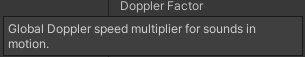 유니티의 프로젝트 세팅에서 Doppler Factor 수치는 기본적으로 1이다. 이 수치는 소리의 움직임이 실제 도플러 효과와 거의 동일하게 시뮬레이션되며 값이 0에 가까워질수록 도플러 효과가 감소하고 값이 높아질수록 강조된다.