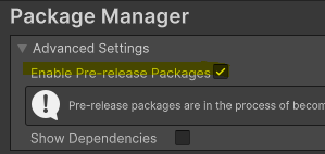 Pre-release Package 옵션을 활성한 이후에 패키지를 검색하면 찾을 수 있다.
