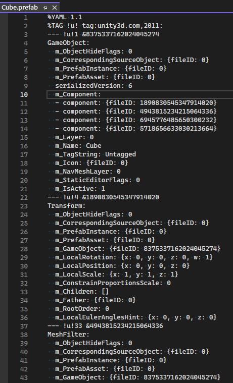 프리팹의 정보가 키&밸류 형태로 정리되어있어 바이너리와 달리 사람이 쉽게 읽을 수 있도록 표현되었다.