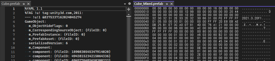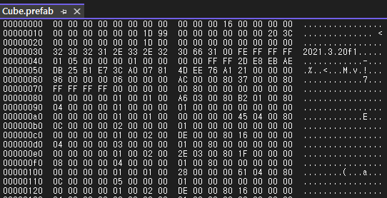 임의의 프리팹을 생성하고 파일을 열어보면 바이너리로 저장된걸 확인할 수 있다.