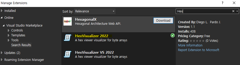 비주얼 스튜디오에서 파일이 열리지 않는 경우 Extensions > Manage Extensions 에서 HexVisualizer 를 설치하면 된다. 이때 실행중인 비주얼 스튜디오는 모두 종료해야 설치가 진행된다.
