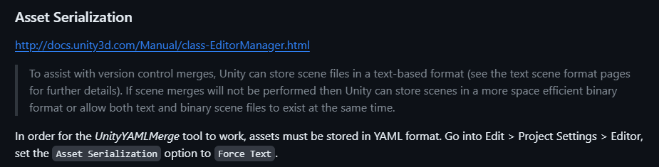 하지만 유니티를 사용한 프로젝트를 협업할 때에는 바이너리보다는 Text 가 권장된다. Github에서는 공식문서에서 해당 부분에 대하여 Force Text로 설정해야 한다고 명시해 두었다.