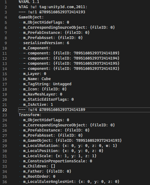 파일의 크기는 3kb이며 파일 내용은 YAML 형식으로 오브젝트의 모든 컴포넌트의 정보가 저장되어 있다.