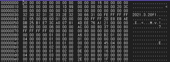 좌측의 메모리주소와 우측의 아스키코드에 대응하는 문자는 편집기의 기능으로 데이터에 포함되지 않는 정보일 것이다.
