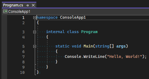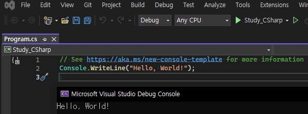 프로젝트가 열리면 기본으로 Program.cs 스크립트가 만들어져있고 Hello World!를 출력하는 코드가 작성되어있다.