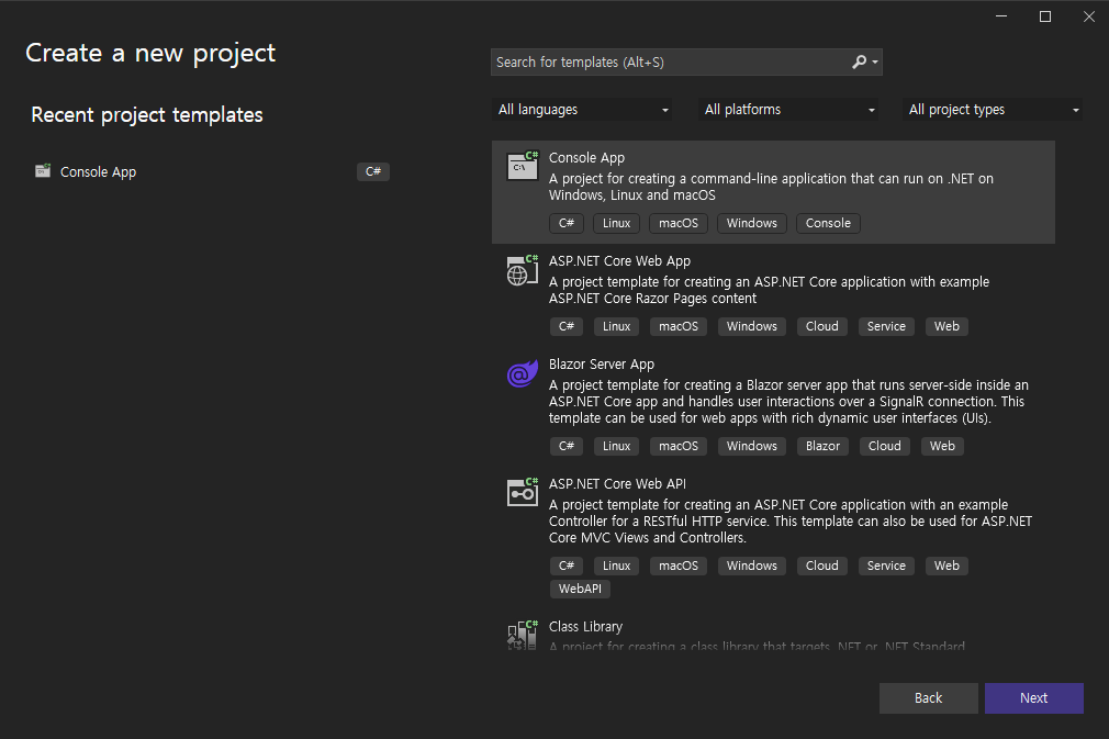 사용하는 버전은 Visual Studio 2022이며 프로젝트 템플릿은 .Net 환경의 Console App 을 사용한다,