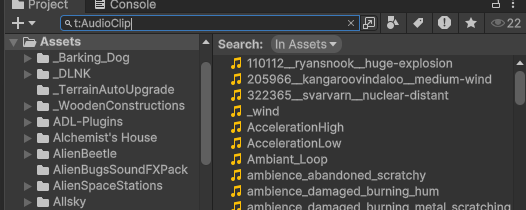 - 오디오 파일 검색 : 't:AudioClip'