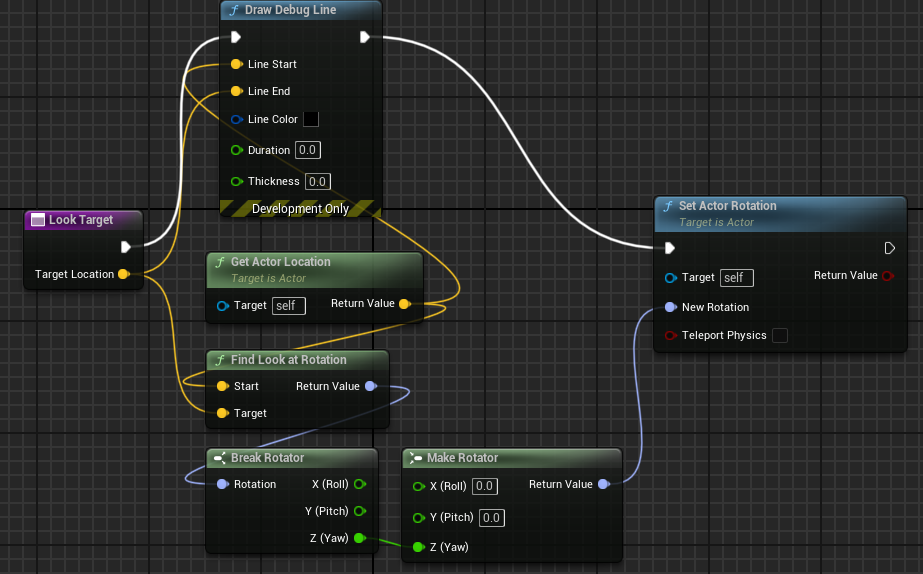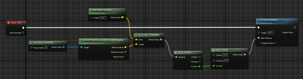 'Start'에는 'GetActorLocation'으로 캐릭터의 위치를 가져와 연결하고 'Target'에는 'ConvertMouseLocationToWorldSpace'의 'World Location'과 연결시킨다. 이렇게 구해온 회전값을 이제 캐릭터의 회전에 적용시키면 되는데 여기서 Z축의 회전값만 필요하기 때문에 'Break Rotator'와 'Make Rotator'를 사용해서 필요한 값만 리턴되도록 만들어 'Set Actor Rotation'의 'New Rotation'에 연결시킨다.
