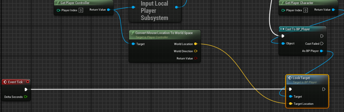 이렇게 접근한 'Look Target' 함수에 'Convert Mouse Location To World Space'의 'World Location' 값을 연결하고 이 함수를 'Event Tick'으로 호출한다.