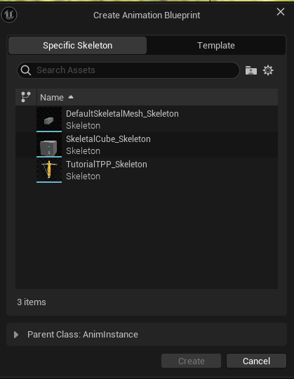 플레이어의 스켈레톤인 TutorialTPP_Skeleton을 선택하여 생성한다.