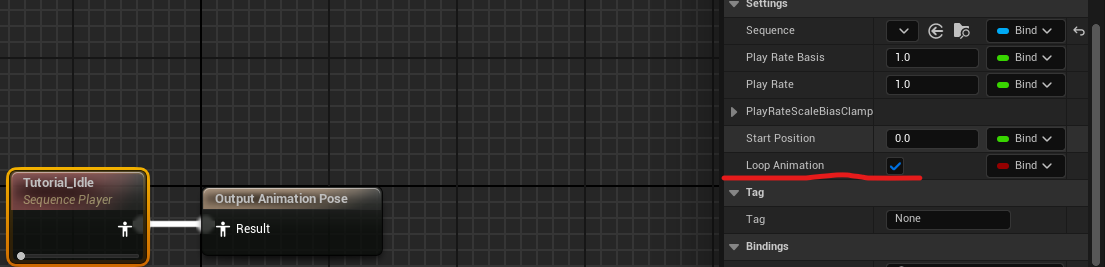 세부설정에서 해당 애니메이션 노드를 선택하고 디테일 창 > Settings > Loop Animation을 체크해서 반복 재생하도록 한다.