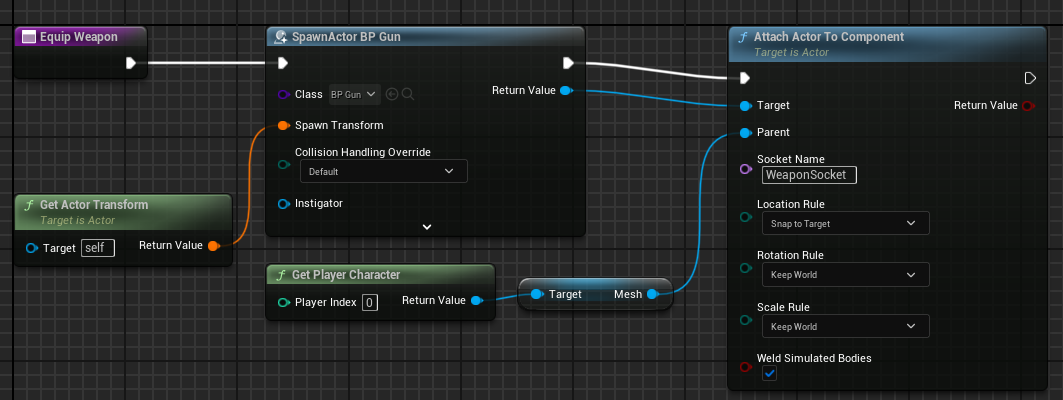 Attach Actor to Component는 액터의 위치를 특정할 수 있다. 여기서 위에서 플레이어 캐릭터의 Skeleton Tree에 추가한 소켓에 위치하도록 설정한다.