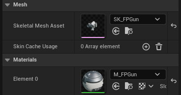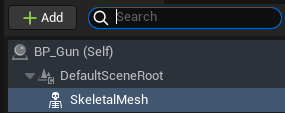 BP_Gun은 기본적인 클래스인 Actor를 상속하여 만들고 메시를 넣기 위해서 SkeletalMesh 컴포넌트를 추가한다.