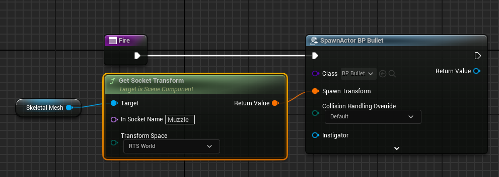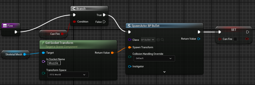 Spawn Actor from class를 사용해서 BP_Bullet을 생성하고 탄환이 생성될 위치는 총의 SkeletalMesh에서 총구의 위치에 소켓을 만들고 Spawn Transform의 위치로 사용한다.