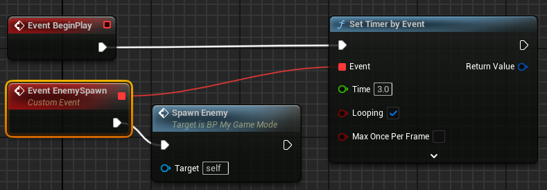 BP_MyGameMode의 Event Begin Play에서 Set Timer by Event를 호출하고 Custom Event인 EnemySpawnEvent를 만든다. EnemySpawnEvent는 SpawnEnemy를 호출하는 기능만 하며 Set Timer by Event의 Event 파라미터에 등록한다.