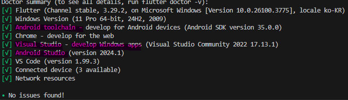 문제가 모두 해결되었는지 다시 flutter doctor를 실행해서 확인한다.