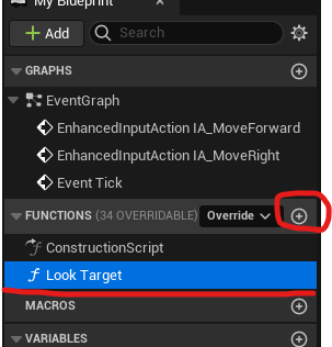'BP_Player'에 Look Target이라는 타깃을 기능만 담당하는 함수를 추가한다.