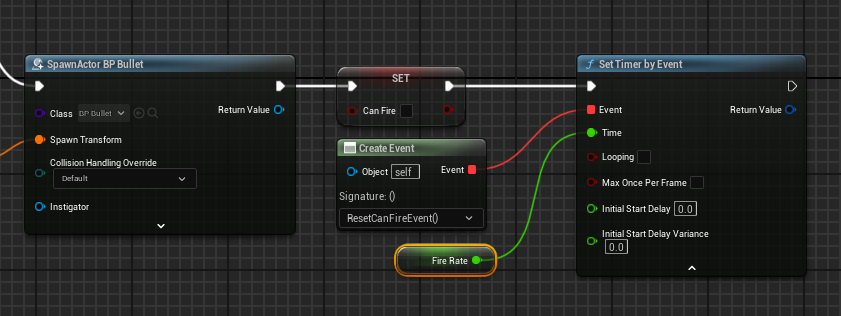 BP_MyGameMode의 Event Begin Play에서 Set Timer by Event를 호출하고 Custom Event인 EnemySpawnEvent를 만든다. EnemySpawnEvent는 SpawnEnemy를 호출하는 기능만 하며 Set Timer by Event의 Event 파라미터에 등록한다.