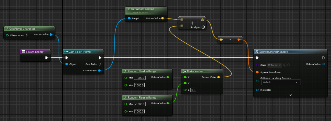 Spawn Actor BP Enemy의 Spawn Transform에 생성한 무작위 위치를 할당하고 class는 BP_Enemy로 설정해 준다.