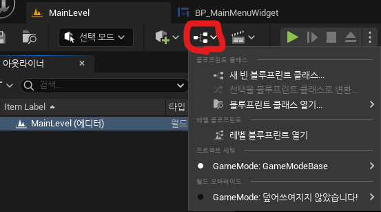 플레이 시 자동으로 생성되던 Character나 PlayerController 등의 엑터들은 'GameMode'에 의해서 결정되던 것이다.
