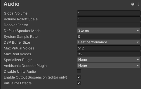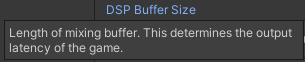 유니티의 기본 DSP 버퍼 크기를 사용한다. 대부분의 경우 적절한 응답성과 지연 시간을 제공하는 안정적인 설정이다.